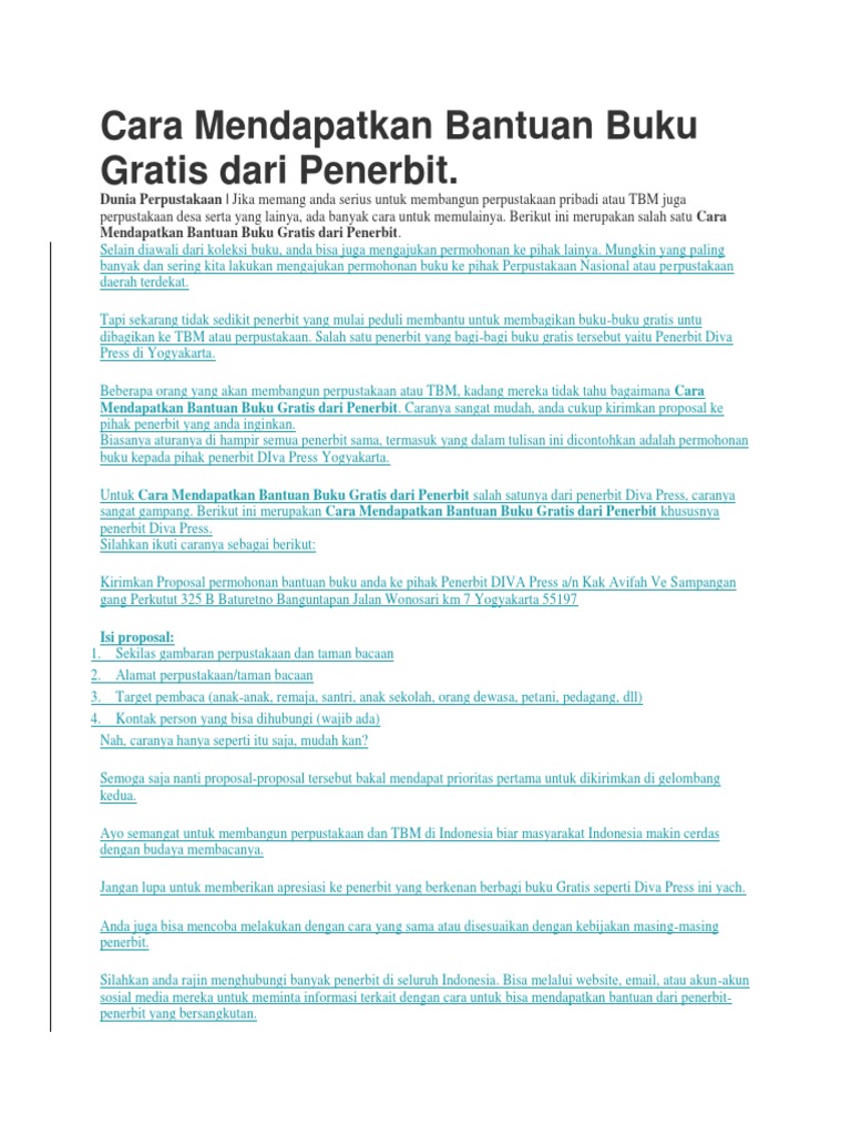 Kirimkan proposal permohonan bantuan buku anda ke pihak penerbit diva press a/n kak avifah ve sampangan gang perkutut 325 b baturetno banguntapan jalan wonosari km 7 yogyakarta 55197. Telusuri indeks buku teks paling komprehensif di dunia. Namun beberapa hal yang tidak boleh lupa kamu cantumkan adalah sinopsis naskah, naskah, dan data diri lengkap. Persyaratan & tata cara pengiriman naskah ke penerbit kpg. Kamu bisa bawa catatan, dengerin lagu, nonton film, hingga baca buku. It is very fun and interesting. Bitread hadir dengan berbagai program penerbitan dan penulisan yang seru dalam semangat terbitkan bukumu !. Situs download buku gratis pdf terbaik saat ini. Penerbit baca jalan raya jombang no. Oleh karena itu, pada artikel ini berakal akan memberikan beberapa situs download buku gratis. Bitread merupakan penerbit indie dengan platform digital. Berikut ini merupakan cara mendapatkan bantuan buku gratis dari penerbit khususnya penerbit diva press. Oleh choirun nadjib diposting pada 12 desember 2020.